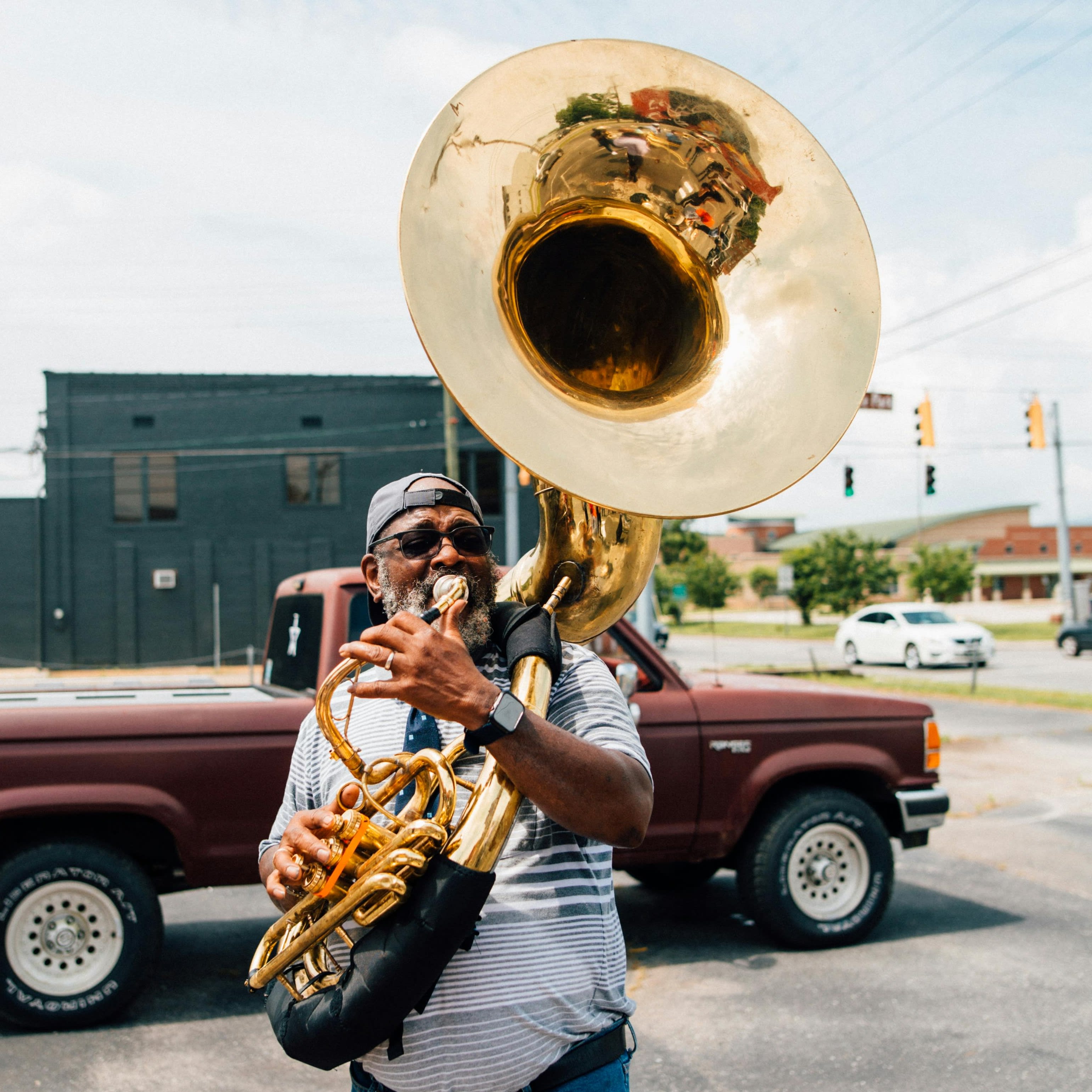 A large, powerful brass instrument with deep tones, perfect for marching bands and orchestras.